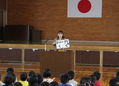 7月17日(木) 環境委員会の主催で今月のクローバ集会が行われました。「一武小・みんなで環境を守る!!8つの約束」について、クイズ形式で再確認しました。