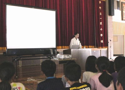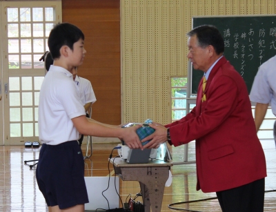 その後、ライオンズクラブについての説明があり、「ライオンズクラブは、地域の方が安全に生活できるようにいろいろな活動を行うボランティア団体です。今回は、錦ライオンズクラブ発足15周年記念の活動として、皆さんに防犯ブザーを贈ります。これからも、安全で楽しい学校生活を送って下さい。」とメッセージが伝えられました。