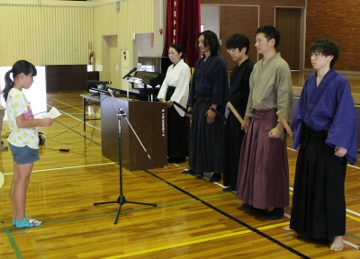 また、ふるさと講演会では、「兵法タイ捨琉剣術」の師範・上原エリ子さん(4年生児童の保護者)他5名の方による講話と演武の披露がありました。「兵法タイ捨琉剣術」は、錦町ゆかりの剣豪・丸目蔵人が創始した剣術です。