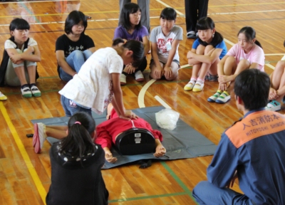その後、保護者および6年生児童は体育館に残り、下球磨消防組合の所員の方から『心肺蘇生法講習会』を受けました。保護者の方々は、夏休みのプール監視を控え、真剣な表情で講習を受けていました。