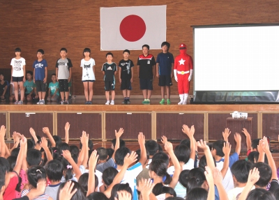 「環境を守るヒーロー」に扮した環境委員の児童も登場し、みんなで楽しみながらの集会でした。