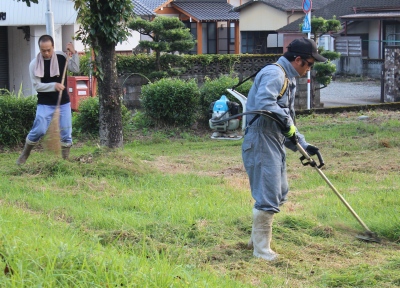 保護者の方々には各分館ごとに除草する場所が割り振られ、刈り払い機等を使って草を刈っていただきました。子どもたちは運動場や学級花壇の草取りを行いました。