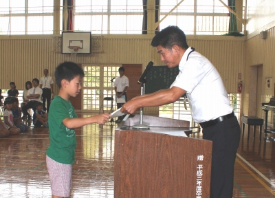 続いて、校長先生から通知表について話があり、「通知表には、1学期に頑張ったことや、これからもっと頑張って欲しいことを、担任の先生が書いていただいています。お家の人と一緒に見て、この1学期をしっかりふり返って下さい。」と伝えられました。