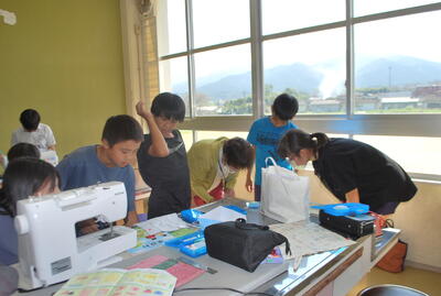 1日は、ボランティアの皆さんにも来ていただいて、ミシンの使い方、縫い方等を