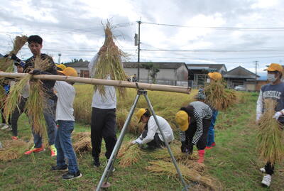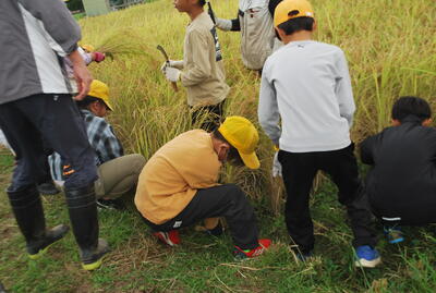 5年生は、岩見さんに稲刈りのやり方を教えてもらい、ノコ鎌を持って田んぼに入りました。刈った稲は束にして、干しました。