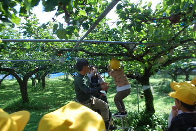 梨の採り方を教えていただき、一人一人丁寧に梨を収穫する体験をしました。