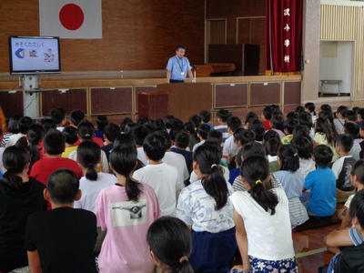 校長講話では、「①命を大切にすること ②規則正しく生活すること ③きまりを守ること」について話をされ、子どもたちは真剣な表情で話を聞いていました。