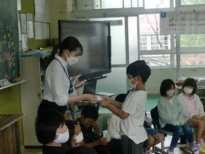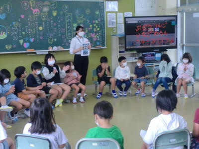 読書標語のお知らせや図書館の使い方についての発表でした。また、「だるまさんが」という絵本の読み聞かせがありました。
