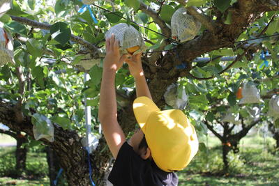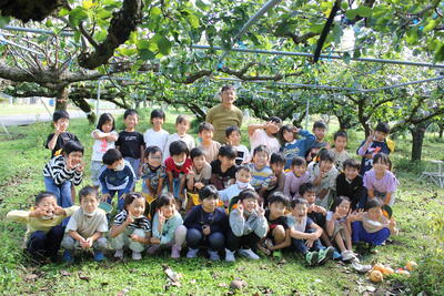 子どもたちは、牟田さんから梨の採り方を教えてもらうと、さっそく一人ずつ大きな梨を見つけて上手に収穫していました。お土産に一人2個ずつの梨をもらって嬉しそうでした。