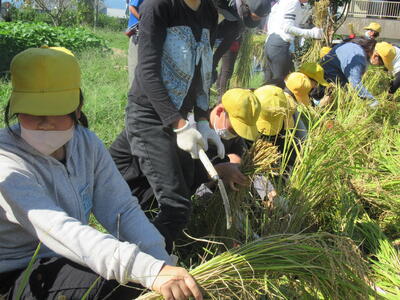 今日は、本校敷地内にある「一武っ子田」で5年生の稲刈りがありました。米作りでお世話になっている岩見さんに丁寧に教えていただき、上手に稲を刈ることができました。