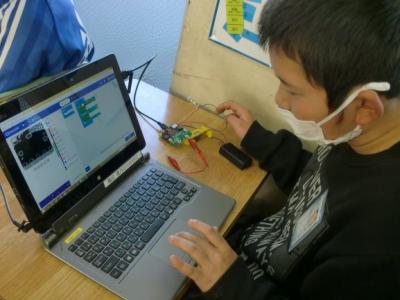 今日は、6年生の理科の学習で、プログラミング教育の一環でマイクロビットを使った授業がありました。授業は、センサー機能がついている電球に、設定した暗さになると電球が点くようにプログラムし、実際に電球が点くがどうかを確かめる、という内容でした。