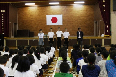 続いて、一武小に職場体験に来ている錦中学校生徒の紹介があり、4名の中学生がそれぞれ簡単に自己紹介を行いました。「一武小のみんなと一緒に、しっかり勉強していきます。」と意気込みを述べました。