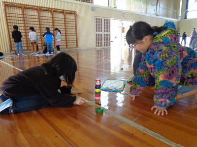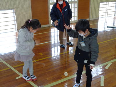 今日は、1、2年生合同の「昔遊び交流会」がありました。