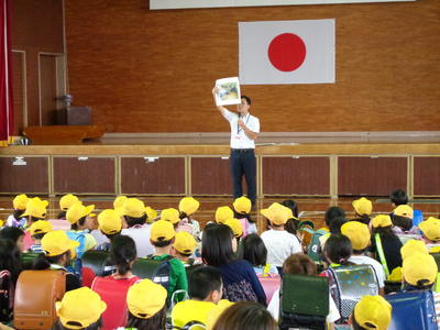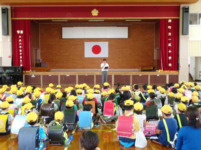 今日は「人吉球磨地方に大雨警報が発令され、児童を早急に下校させる」という想定で水防避難訓練を行いました。5時間目終了後、子どもたちは担任の指示に従い、速やかに体育館に集合しました。担当からの話の後、分館毎に一斉下校をしました。これから雨の多くなる時期になります。今回の訓練を生かして、安全に下校してほしいと思います。