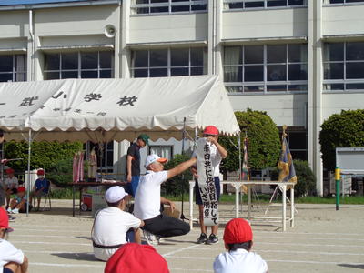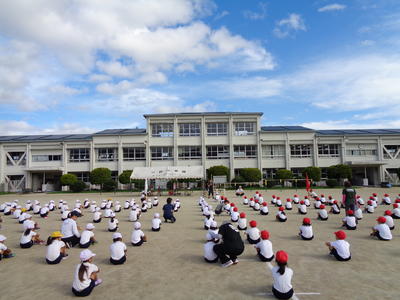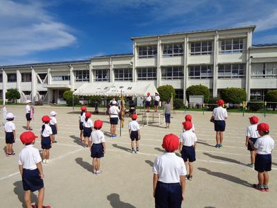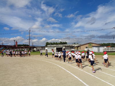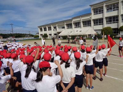 スローガン発表の後、基本的な動作や入場行進、開会式の練習をしました。暑い中でも、子どもたちは入場行進や開会式の練習に一生懸命頑張っていました。
