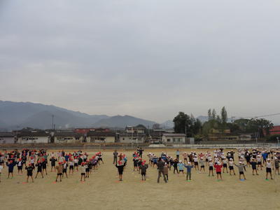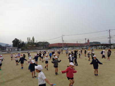 そして、3分間の持久跳びにチャレンジしました。前跳びやかけ足跳び、あや跳びなど、様々な跳び方が見られました。子どもたちは、時間いっぱいがんばっていました。