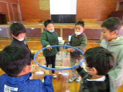 1~3年生の人権集会では、「友だちを大切にしよう」というテーマのもと、手をたたいた数だけグループを作ったり、グループの友だちと協力する活動を通して、お互いの絆を深めることができました。最後は、絵本の読み聞かせをしました。