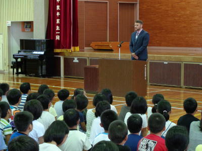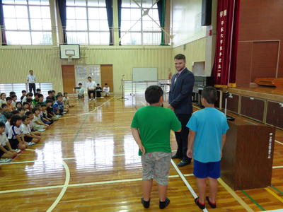 集会に、プレストン先生に一武小学校の子どもたちの印象を聞くと、「明るく元気だね!」と話されました。これからよろしくお願いします!!