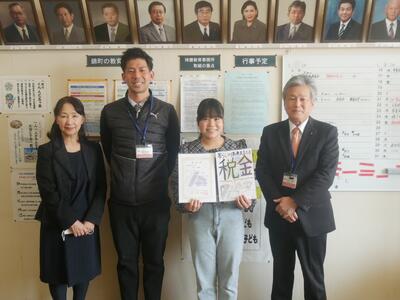 本日、校長室にて「税に関する絵はがきコンクール」の表彰式がありました。応募総数425点の中から本校 6年生の中村 芽衣さんの作品が「奨励賞」を受賞し、表彰状並びに記念品を、公益社団法人 人吉地区法人会様より授与されました。受賞を受けた中村さんは、笑顔で「大人になったら、税金の事を考えて、きちんと払おうと思う。」と感想を述べていました。