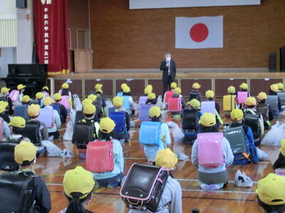 5校時終了後の校内一斉放送を合図に、全児童は下校準備をした後、体育館に集まりました。
