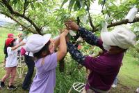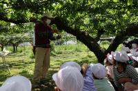 昨年は、新型コロナウイルスや大雨等の関係で行けなかった牟田さんの梨園に今年は行くことができ、子どもたちは出発前からとてもわくわくしていました。梨園に着いてから、梨、桃の袋がけの説明などをしていただきました。子どもたちは一人ずつ袋がけをさせていただき、最後には質問にも答えていただきました。