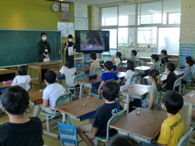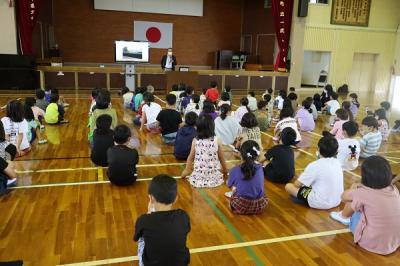 桑原家住宅や丸目蔵人佐の墓など歴史的な建造物やくらんど公園、こども園などの紹介がありました。子どもたちは知っている場所が出ると元気に手を挙げて反応をしていました。珍しい木造の仏像があると聞き、子どもたちの印象にも残ったようです。最後には子どもたちからの質問にも答えていただきました。