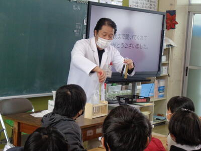 薬剤師の方を講師としてお招きし、薬(内服薬、外用薬、注射)についてや、薬の飲み方などのお話がありました。実際に、薬を「水」に入れたときと「お茶」に入れたときの実験をされ、子どもたちは興味津々でした。