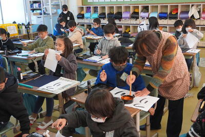 富澤様からは、「筆の正しい持ち方」や「穂先の向き」、「文字の大きさ」などについてお話をしていただきました。子どもたちにお話していただいた後は、机間をまわって、子どもたちにアドバイスをしていただきました。