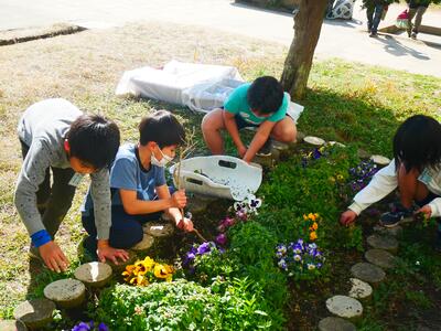 本日は、今年2回目の「グリーンアップタイム」でした。掃除の時間になると、子どもたちは、進んで自分の花壇の除草作業や、枯れた花を摘んだりしながら、学級の花壇の整備をしました。