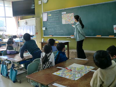9日(金)に、1年生で「7歳の交通安全マップ」を使った交通安全についての学習を行いました。