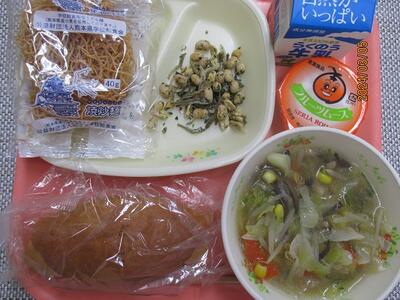 玄米パン 牛乳 パリパリやきそば 豆といりこの香り和え フルーツムース