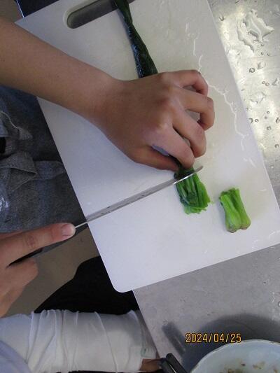 ほうれん草を茹でる授業は、5年生が家庭科の調理実習で取り組んでいました。工夫しながら、とても上手に作っていました。写真の掲載します。