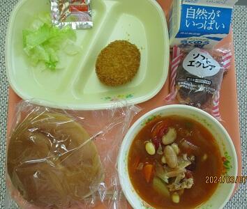 今日は、パン、メンチカツ、ソース、レタスをはさんで食べるセルフバーガーです。メンチカツには、お肉と一緒に大豆、ごぼうが入っているので風味と噛みごたえがプラスされていました。パンにはさんで食べても味のバランスが良かったです。