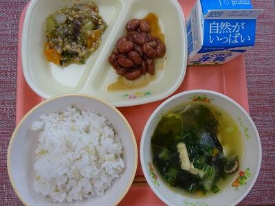麦ごはん 牛乳 いかのピリ辛スープ なすのそぼろ炒め 金時豆の甘煮