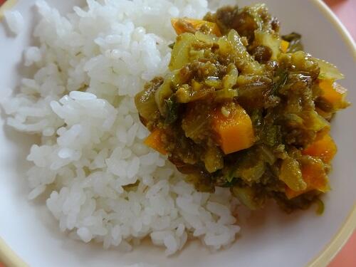 ドライカレーは、蒸し暑い時でも、しっかりご飯が食べられるように作りました。牛と豚のひき肉、玉ねぎ、人参、セロリ、ピーマンをしっかり炒め、カレー粉、ケチャップで味をつけました。また、小さい豆は、栄養価の高い『レンズ豆』です!野菜も小さく切ったので、食べやすかったようです。スタミナ満点のドライカレーは、ごはんとの相性抜群でした!
