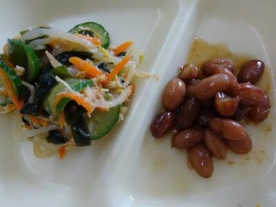 麦ごはん 牛乳 八宝豆腐 バンバンジーサラダ うずら豆の甘煮