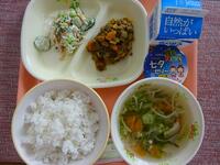麦ごはん 牛乳 いかのピリ辛スープ なすのそぼろ炒め 金時豆の甘煮