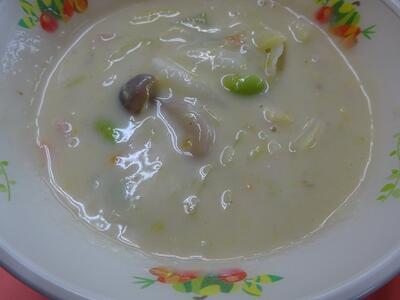 さて、キャベツのミルクスープは、具だくさんのスープです!とろみは米粉でつけました。牛乳、チーズ、生クリーム、バター、白いんげん豆ペースト、枝豆ペーストを入れ、シチューのような仕上がりになりました。野菜もしっかり食べられるミルクスープになりました。