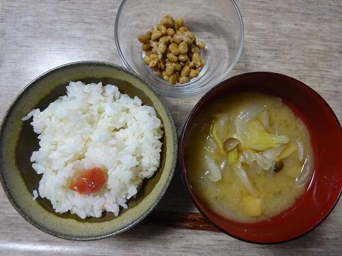 副菜は、「納豆」です。わが家の子どもたちは、納豆が少し苦手です。そこで、1回に食べる量を少なくして、食べています。朝ごはんに、タンパク質の多い食品を取り入れることは、体温上昇につながるそうです。朝ごはんの品数を増やすことはなかなか難しいので、わが家では、おみそ汁を基本にしているところです。
