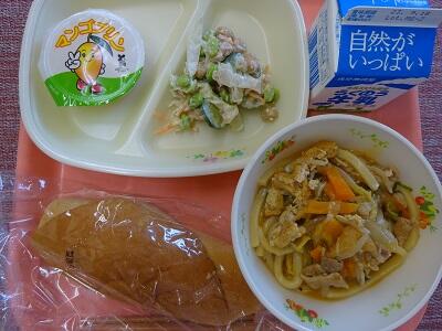 玄米パン 牛乳 キムチ鍋うどん ビーンズサラダ マンゴープリン