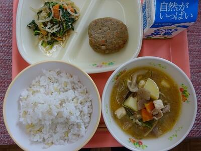 古代米入りご飯 牛乳 ポークカレー たくあんの香り和え 抹茶豆