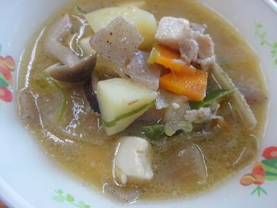 さて、今日の汁物は、すりつぶした大豆を入れて作った「呉汁」です。呉汁は、日本各地に伝わる郷土料理です。大豆を水に浸して、すりつぶしたものを「ご」と言います。その「ご」をみそ汁に入れたものが、「呉汁」です。今日の給食の呉汁は、食べやすいように、「呉汁のもと」を入れて作りました。お椀の中の呉汁には、大豆の栄養素、味噌の塩分、野菜のビタミンやミネラルがたっぷり含まれています。