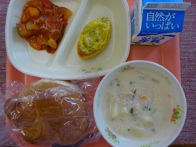 コッペパン 牛乳 ウインナー 野菜ソテー とうがんのスープ