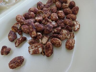 今日は、よく噛む献立の「ココア豆」を出しました。材料は、炒り大豆、ピーナッツを、ココア味(ピュアココア、砂糖、黒砂糖、みりん)でからめて作りました。