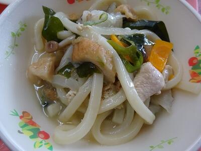 今日の五目うどんは、2種類のかつお節といりこで出汁を取りました。味は、塩、みりん、薄口しょうゆ、濃口しょうゆを入れました。鶏肉、油揚げ、ちくわ、わかめ、乾ししいたけ、野菜の味もしっかり出て、とてもおいしかったです。給食は、たくさんの量を作るので、子どもたちが食べる頃には、うどん麺が出汁を吸ってしまっていました。