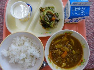 麦ごはん 牛乳 夏野菜カレー かいそうサラダ ヨーグルト