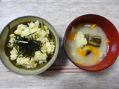 夏野菜のみそ汁は、かぼちゃとなすを入れて作りました。今日のかぼちゃは、実が黄色でほくほくしていました。かぼちゃの甘みとかくし味の豆乳で、まろやかなおみそ汁になりました。