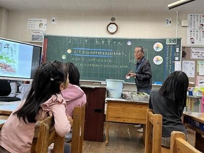 地域に住む松本さんにお越しいただき、1,2年生が季節の植物や生き物をモデルにした絵手紙に挑戦しました。