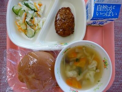 丸パン 牛乳 野菜たっぷりスープ てりやきチキン コールスローサラダ