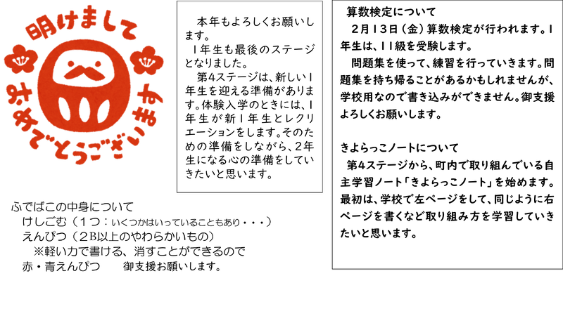 新しい年になりましたね。そして、第4ステージの始まりの日です。1月は、「さあ!スタートだ!」と いう気持ちになりますね。2年生にとって、この第4ステージは、2年生の残りの学習とまとめをしたり、3年生への準備をしたりする期間でもあります。そして、第4ステージは、1月は、行く月、2月は、逃げる月、3月は、去る月と言われるように、あっという間に終わってしまう期間ですね。だからこそ、今の自分のいいところやもっとこんな自分になりたいという見つめることを大事にして、毎日毎日の授業や友だちとのふれあう時間、給食や掃除、放課後、そして、家に帰ってからの時間中で、あたりまえでなく、できない自分を責めるだけでなく、がんばったよ!嬉しかったよ!チャレンジしてみたよ!友だちも素敵だったよ!などをみんなで見つけて言葉にして伝え合っていきたいなと思います。第4ステージは、自分の命や周りの命をどんどん輝かせる学習にしていきたいと思います。家に帰ったら手洗いうがいをして、次の日の学習の準備(えんぴつをけずる、ハンカチ、ちり紙をそろえる)をして、しっかり睡眠をとって、朝ごはんを食べてなどのことを丁寧にして気持ちよくスタートしたいですね。
